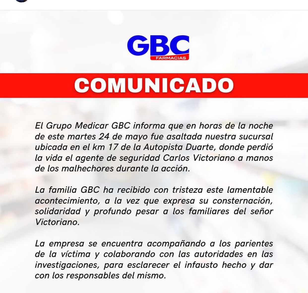 "La familia GBC ha recibido con tristeza este lamentable acontecimiento, a la vez expresa su consternación, solidaridad y profundo pesar a los familiares del señor Victoriano", añade la empresa.