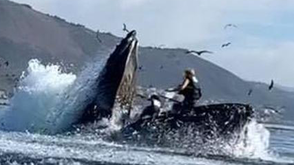 Video que muestra el momento en que 2 turistas son tragadas por una ballena mientras practicaban kayak en playa de California