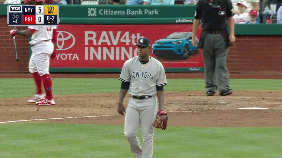 El dominicano Luis Severino (1-2) permitió cinco hits en seis entradas y cuatro relevista terminaron la quinta blanqueada de Nueva York.