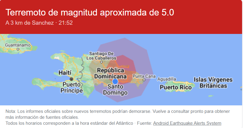 De acuerdo con el Sismológico de la UASD el temblor ocurrió a las 9:52 de la noche, a 10 kilómetros de profundidad, al suroeste de Sánchez, bahía de Samaná.