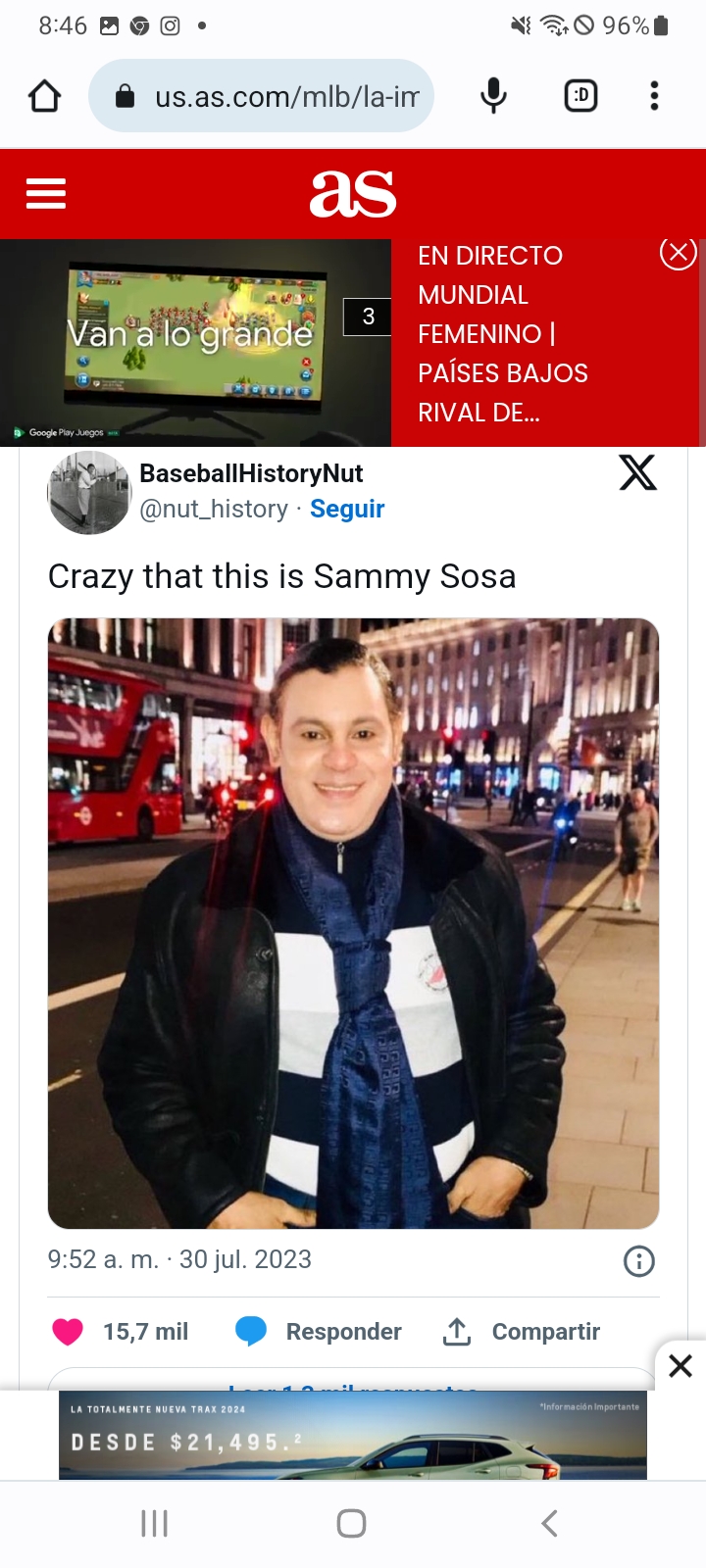 En una foto reciente tomada en Regent Street de Londres, el icónico toletero de la MLB, Sammy Sosa, sorprendió a muchos fanáticos al aparecer… bueno… blanco.