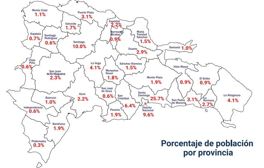 En el X Censo, que se realizó desde noviembre a diciembre de 2022, la provincia Santo Domingo presenta un crecimiento importante en su población 2,769,589 cuando en 2010 reflejó 2,374,370; el Distrito Nacional con 1,029,110 y en 2010 tenía 965,040; Santiago con 1,074,684 y en 2010 963,422; San Cristóbal con 688,828 y en 2010 con 569,930.