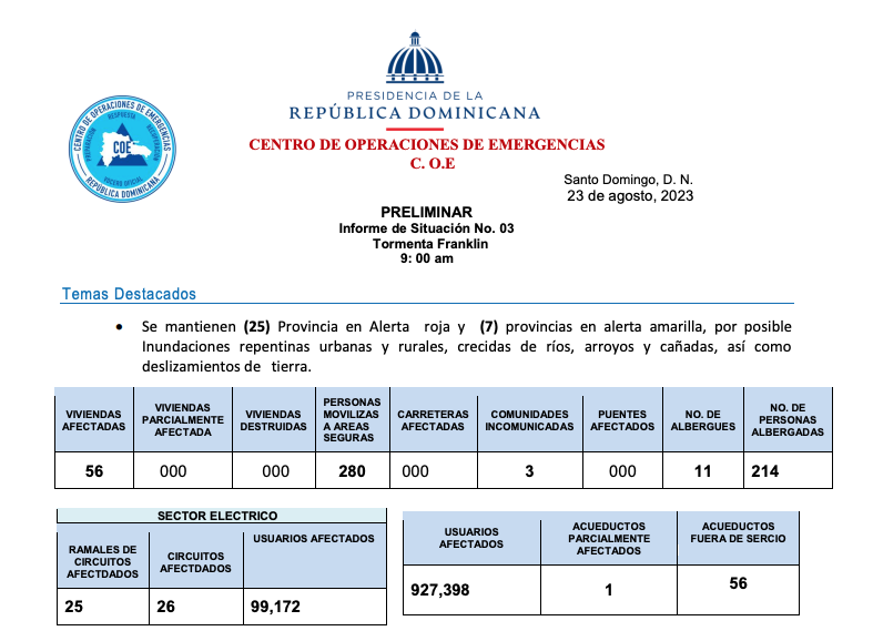 Santo Domingo.-Las lluvias que han estado cayendo en el territorio nacional producto del paso de la tormenta Franklin ya han afectado 56, aislado a tres comunidades y dejado a más de 100 mil personas sin electricidad, así como casi a un millón sin agua potable.