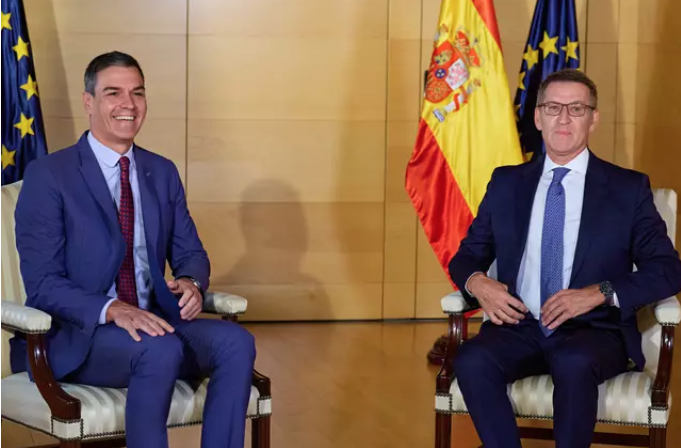 Durante la reunión el líder del PP ha ofrecido a Sánchez una propuesta de dos años de legislatura y seis pactos de estado, algo que el PSOE considera que demuestra que "Feijóo no está trabajando pensando en la estabilidad de su país, sino en cómo salvar su pellejo".