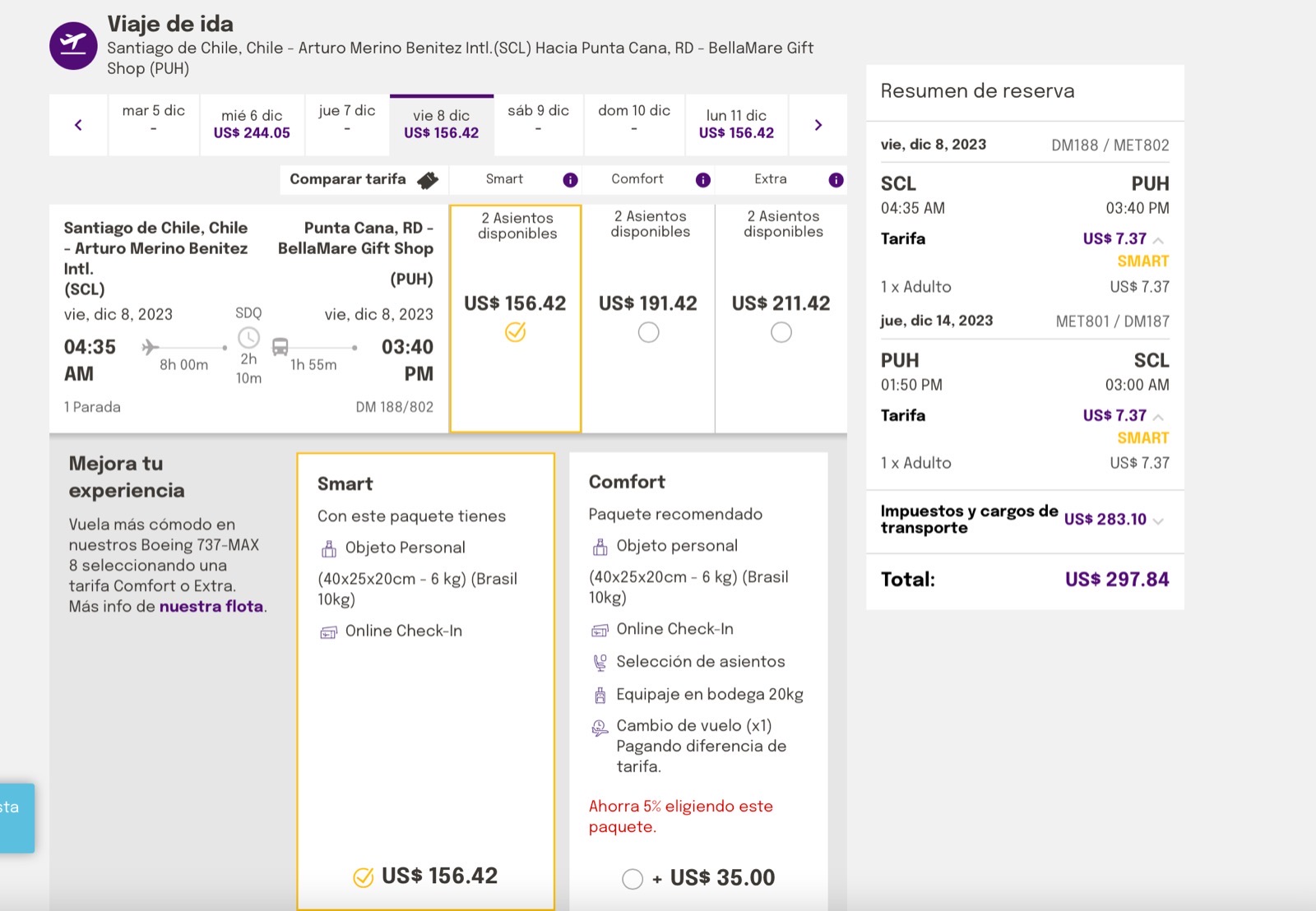 Pacheco además publicó una foto de un ticket desde Santiago de Chile a Punta Cana por Arajet con un precio total de solo 297 dólares ida y vuelta con impuestos incluidos, donde se aprecia que la aerolínea solo cobra la tarifa de 7.37 USD a los pasajeros como parte de la promoción aniversario.