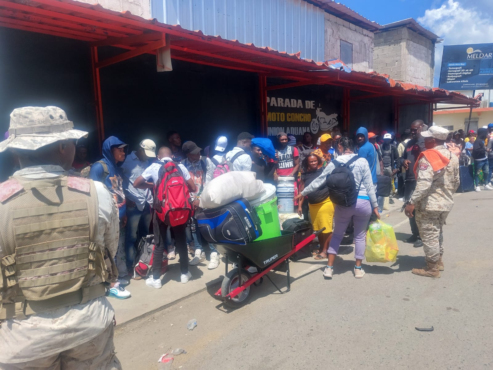 Hombres, mujeres y niños llevando todo tipo de artículos son observados gestionando que los militares dominicanos les permitan ingresar a su país, a los cuales se les advierte que no podrán regresar mientras esté cerrada la frontera.