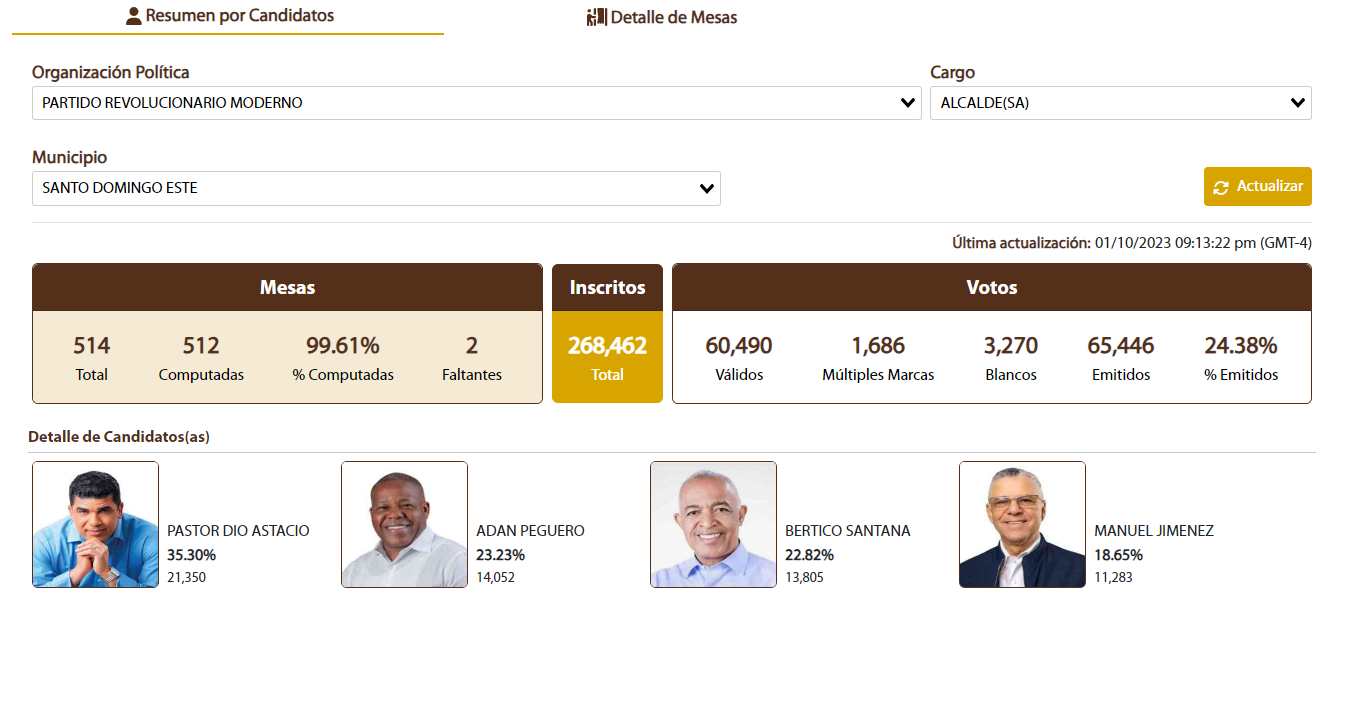 Con 512 mesas computadas, para un 99.61%, Astacio llevaba 21,350 votos para el 35.30% de los 60,490 votos válidos. Adan Peguero obtuvo 14,052 votos para un 23.23%; Bertico Santana ocupa el tercer lugar con 13,805 para un 22.86% y Manuel Jiménez quedó en último lugar con 11,283 votos, para un 18.65%.