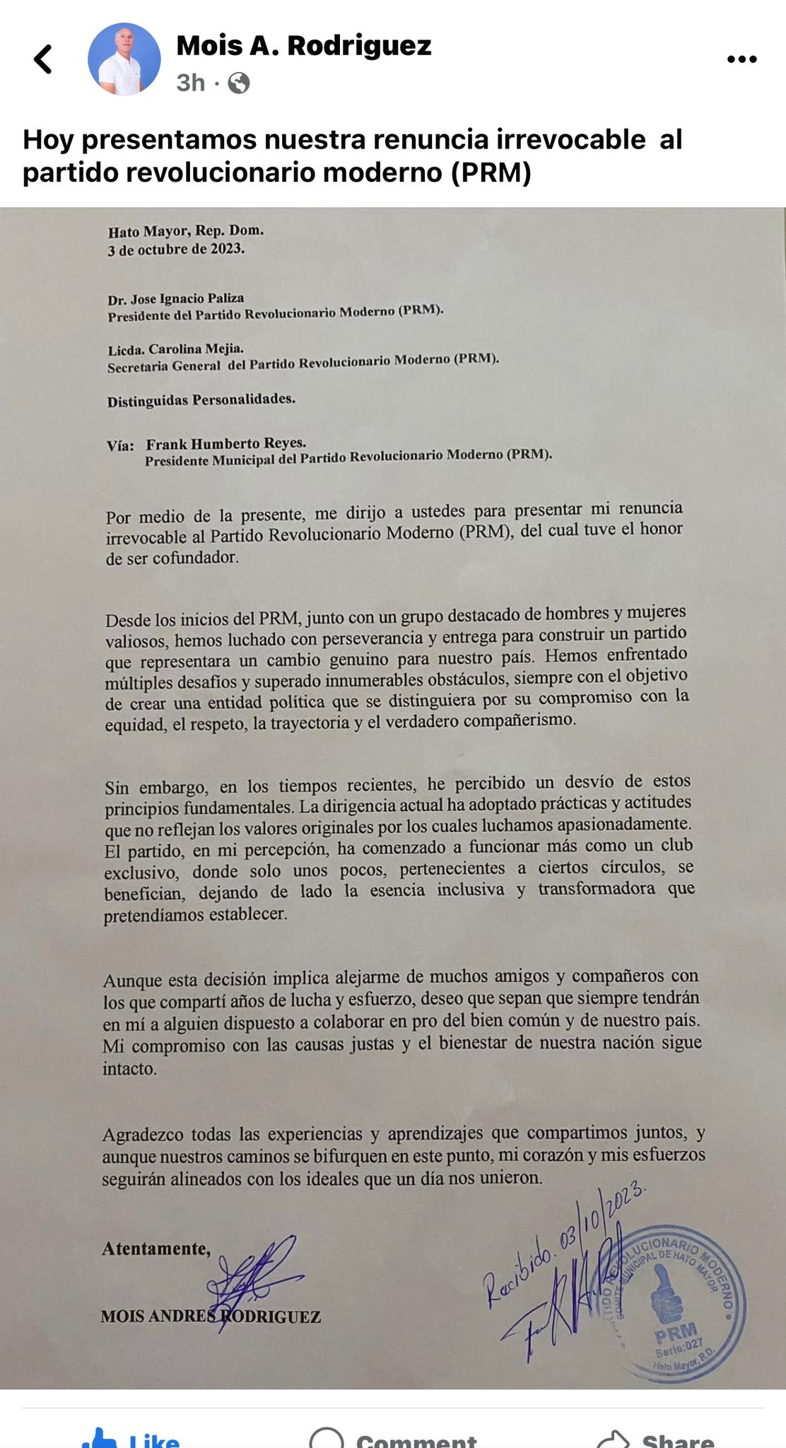Santo Domingo RD–Mediante un comunicado el precandidato Mois Andrés Rodríguez, presentó su renuncia formal del Partido Revolucionario Moderno (PRM), por la razón de que ha percibo un desvió de los principios fundamentales y han adoptado prácticas y actitudes que no reflejan los valores y está comenzado a funcionar más como un club.
