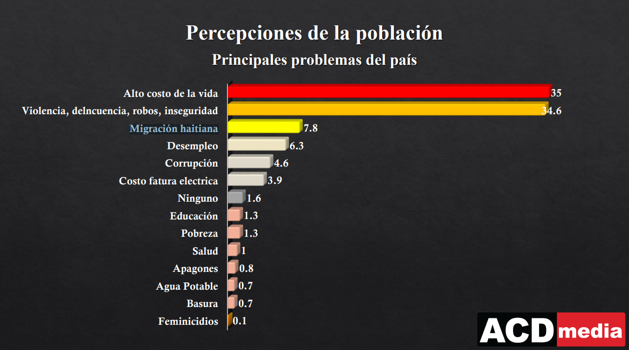 Santo Domingo.-El alto costo de la vida; la violencia, delincuencia, robos, inseguridad; la migración haitiana y el desempleo son los cuatro problemas que más están preocupando a los ciudadanos, de acuerdo a los resultados de la séptima entrega de la Encuesta Nacional de Opinión Pública del Grupo de Comunicación ACDmedia.En el trabajo de campo, que se realizó del 7 al 9 de octubre con una muestra de 1,300 personas registradas en el padrón de votantes de la Junta Central Electoral (JCE), el 35% dice que le preocupa el alto costo de la vida, el 34.6% la violencia, delincuencia, robos, inseguridad; el 7.8% la migración haitiana; al 6.3% el desempleo; al 4.6% la corrupción y al 3.9% el costo de la factura eléctrica.