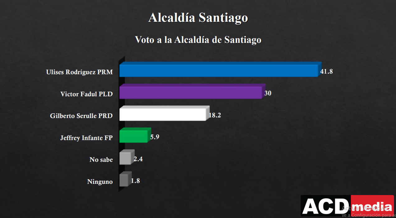 Mientras que en Santiago Ulises Rodríguezdel PRM ganaría con 41.8%, Víctor Fadul del PLD obtendría 30.0%, Gilberto Serulle del PRD 18.2%, Jeffreey Infante de la Fuerza del Pueblo 5.9%, no sabe 2.4% y ninguno 1.8%.
