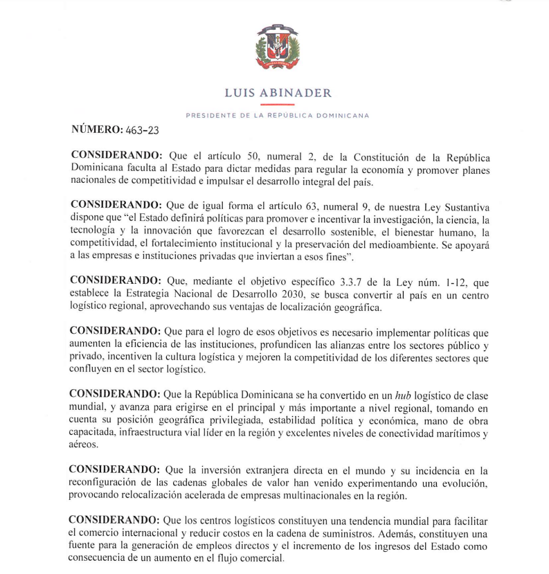 Este nuevo Gabinete, creado mediante decreto 463-23 emitido por el presidente Luis Abinader coordinará los procesos de formulación, ejecución y evaluación de las políticas públicas que inciden en el desarrollo del sector logístico.