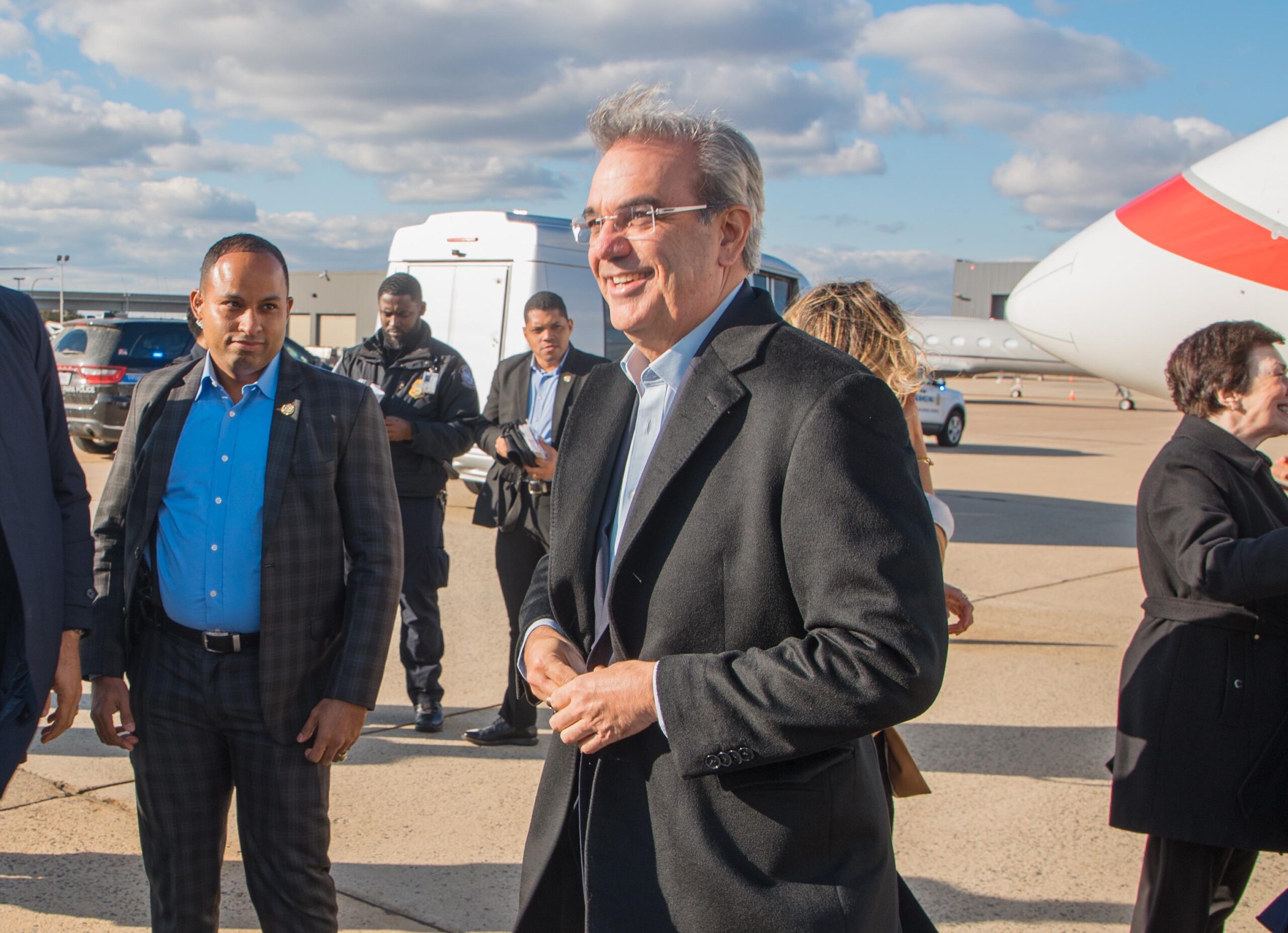 El mandatario viajó la mañana de este miércoles acompañado de la primera dama, Raquel Arbaje, los ministros, de Relaciones Exteriores, Roberto Álvarez y de Hacienda, José Manuel Vicente; el empresario turístico Frank Rainieri, así como sus asistentes, Lourdes Herrera y Eilyn Beltrán. La salida se produjo desde la Base Aérea de San Isidro.