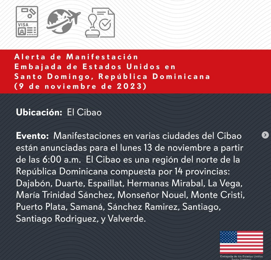 La alerta emitida por la legación diplomática indica que para el lunes 13 de noviembre a partir de las 6:00 AM, habrán posibles manifestaciones en el Cibao en donde los organizadores pretenden protestar contra las políticas económicas y el alto costo de la vida.