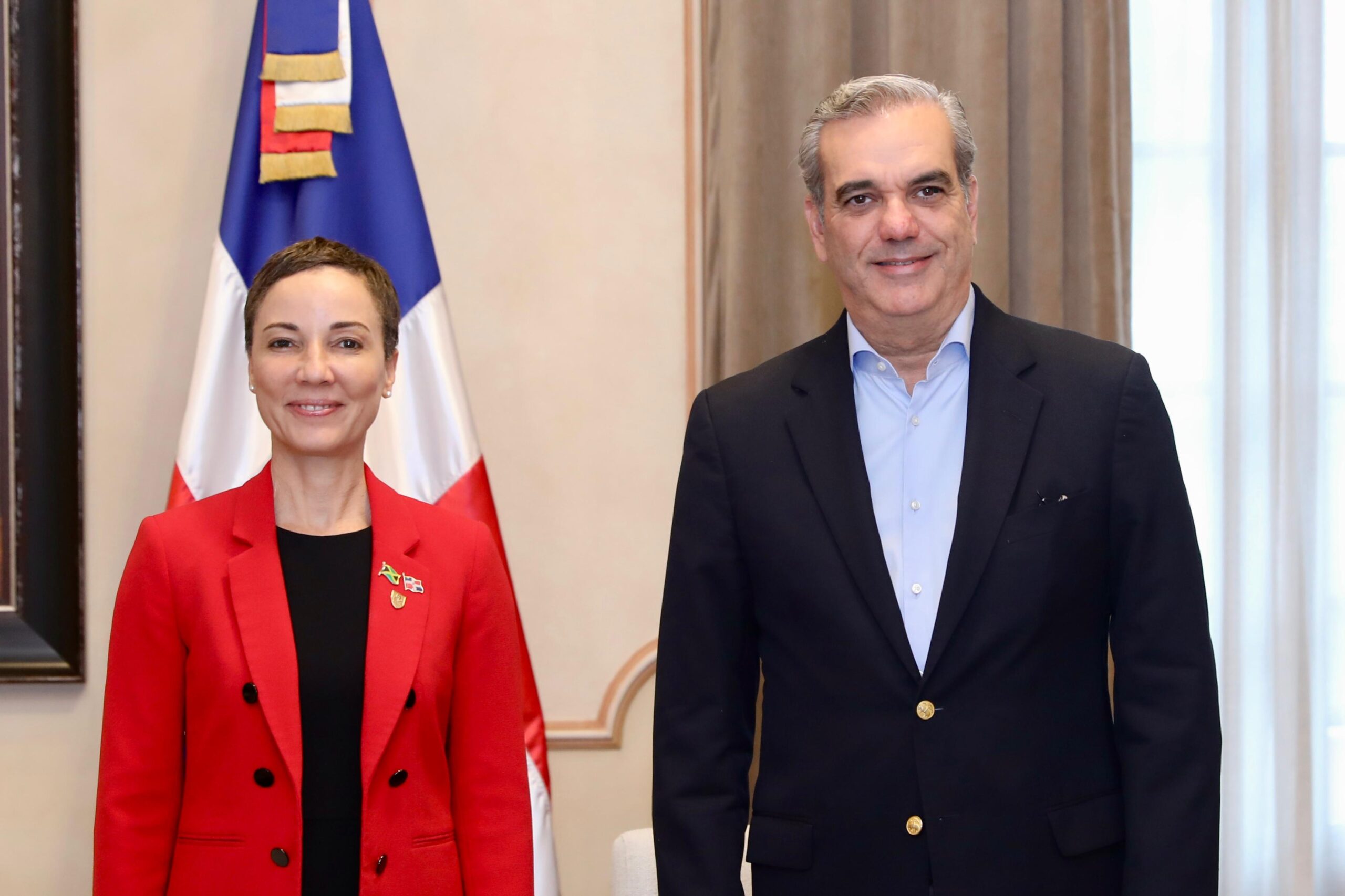 Santo Domingo.- El presidente de la República, Luis Abinader, recibió este jueves a la ministra de Relaciones Exteriores y Comercio Exterior de Jamaica, Kamina Johnson Smith, durante un encuentro en el Palacio Nacional.