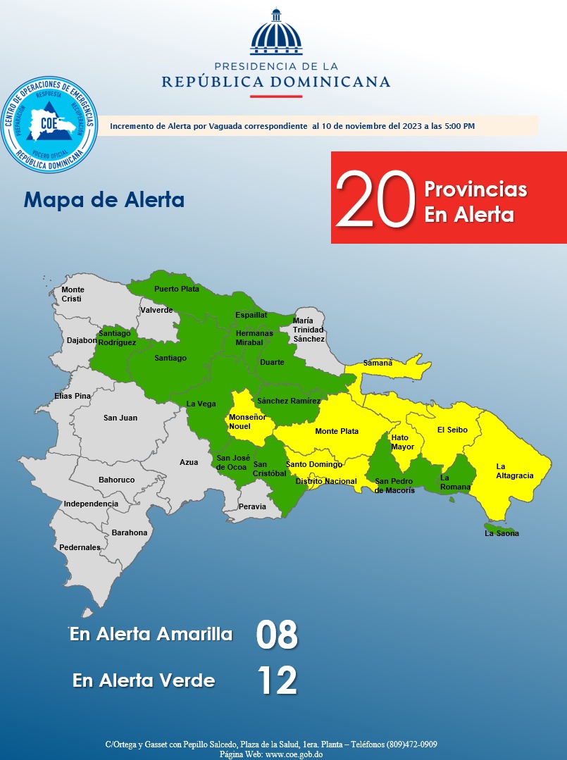 Manifesto que en virtud de lo anterior y lo establecido en el artículo 2 capítulo 1, de la ley 147-02, sobre gestión de riesgos, este Centro de Operaciones de Emergencias (COE), MODIFICA EL NIVEL DE ALERTA VERDE, por posibles crecidas de ríos, arroyos y cañadas, así como inundaciones urbanas y repentinas, por lo que a partir de ahora regirán los siguientes: