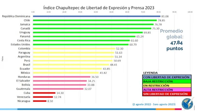 Algunas naciones que evidencian descensos importantes en el Índice Chapultepec son Costa Rica, Colombia, Perú, Argentina, Paraguay, Ecuador. De estas, Costa Rica se mantuvo en la franja de baja restricción.