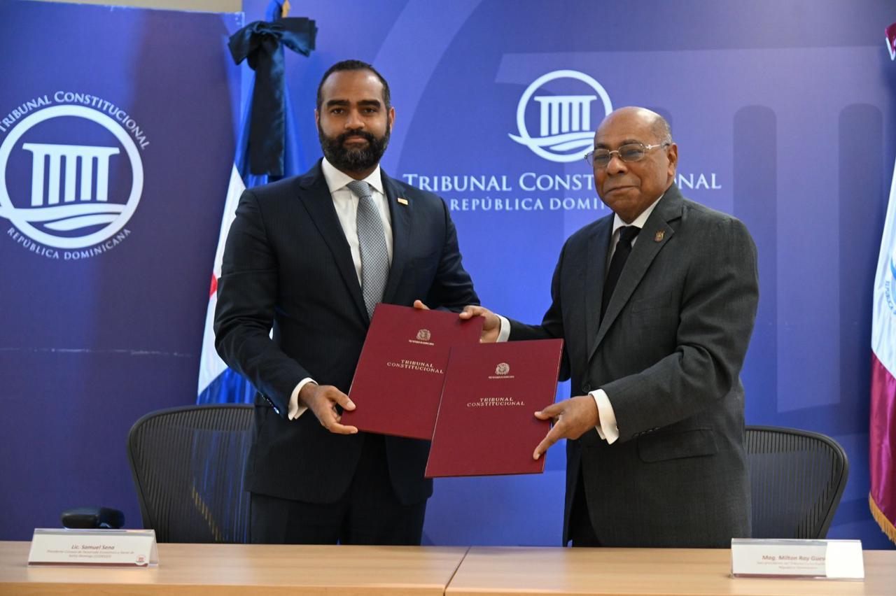 El magistrado presidente del TC, Dr. Milton Ray Guevara, y el presidente del CODESSD, Samuel Sena, rubricaron el convenio en el que ambas instituciones expresan su compromiso de promover los valores de la carta magna y contribuir con el fortalecimiento de la justicia constitucional.