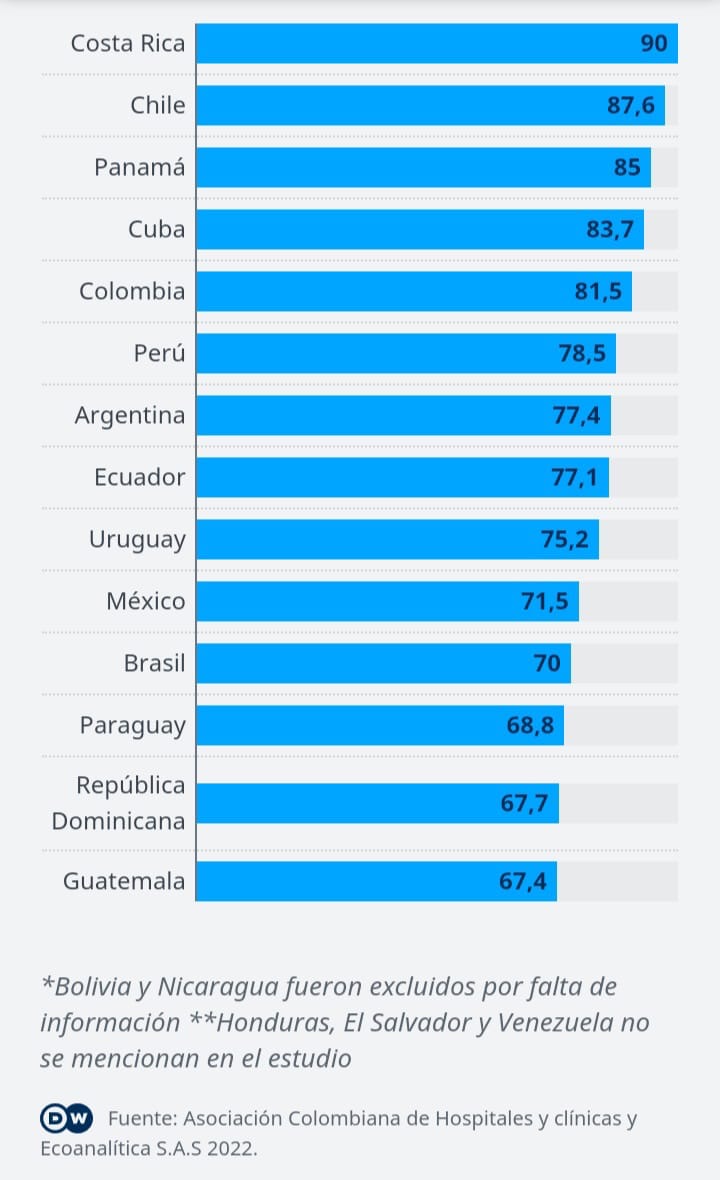 Otro estudio realizado por la Asociación Colombiana de Hospitales y Clínicas (ACHC) en noviembre de 2022 entregó resultados similares (ver gráfico). Basados en el Índice Compuesto de Resultados en Salud (ICRS) -que toma en cuenta 12 variables, como la tasa de mortalidad materna, tasa de enfermedades no transmisibles, financiación o esperanza de vida, entre otros-, Costa Rica, Chile, Panamá y Colombia obtuvieron la mejor puntuación, mientras que Guate… Mejores sistemas de salud en Latinoamérica según el Índice Compuesto de Resultado en Salud (ICRS).