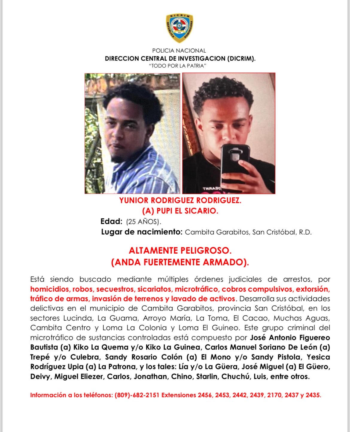 SAN CRISTÓBAL, R.D.- Mediante un arduo operativo desplegado en la ciudad de San Cristóbal por efectivos de la Policía Nacional, cayó abatido la madrugada de este domingo el reconocido delincuente Yunior Rodríguez Rodríguez (Pupi El Sicario), tras haber enfrentado a los uniformados que se disponían a apresarlo.