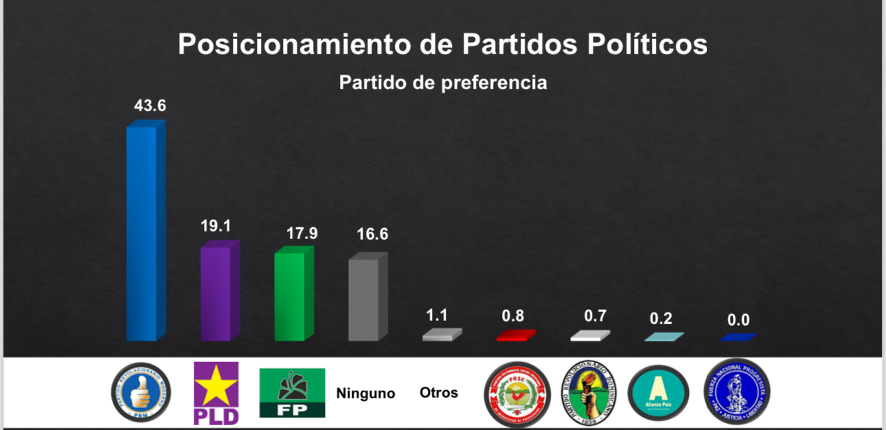 Pero se destaca entre los hallazgos de la encuesta, que el 16.6% de los encuestados no favoreció a ningún partido, 0.8% lo hizo por el Reformista Social Cristiano (PRSC), el 0,7% por el Revolucionario Dominicano (PRD) y el 0.2% por Alianza País.