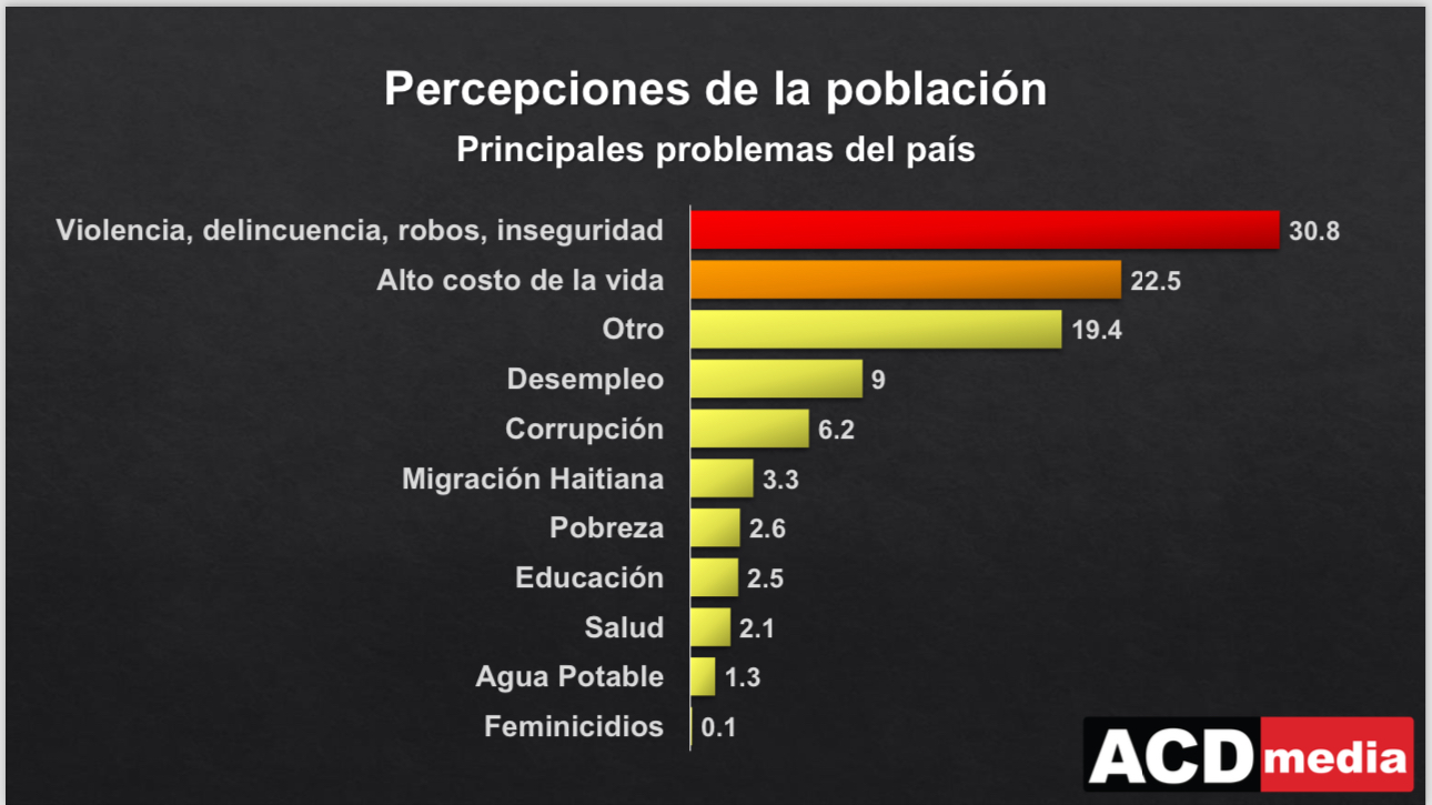 La percepción de los ciudadanos de que la violencia, delincuencia, robos y la inseguridad son los principales problemas del país ha sido una cosntante en las diferentes entregas de la encuesta del grupo de comunicación ACDmedia, después que en la primera en agosto de 2022 apareciera el alto costo de la vida cuando el 42.2% lo consideraron.