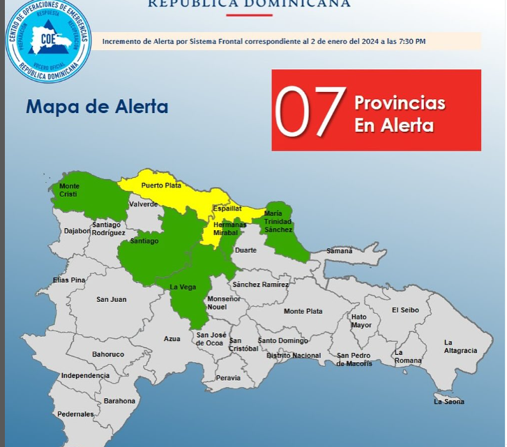 Santo Domingo RD–El Centro de Operaciones (COE), incrementó a 7 las provincias en alerta, producto a la incidencia del sistema frontal que afecta al país.