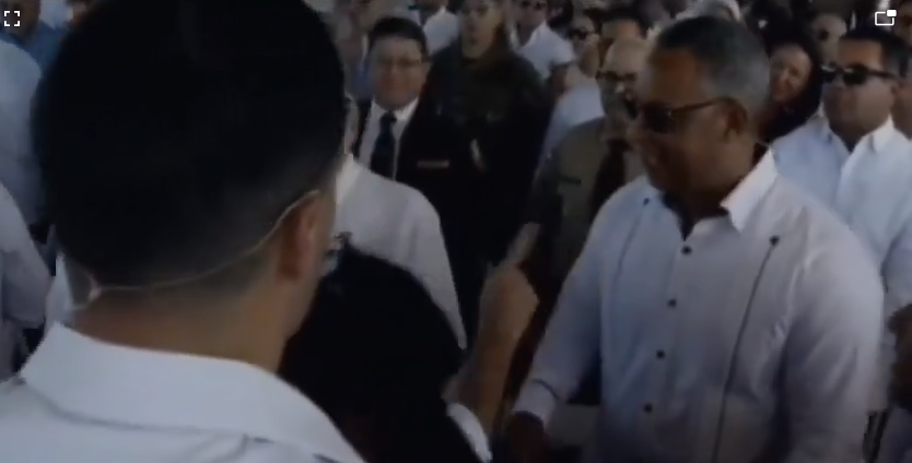 Con un rotundo “No, a mí no” y agitando su dedo índice en señal de rechazo, el mandatario desairó la intención de Sánchez ante la mirada de numerosas personas, incluyendo a los presidentes de las Cámaras Legislativa (Ricardo de los Santos, Senado y Alfredo Pacheco, ríos Cámara de Diputado) varios congresistas de diferente partidos, así como funcionarios, empresarios y turistas extranjeros.