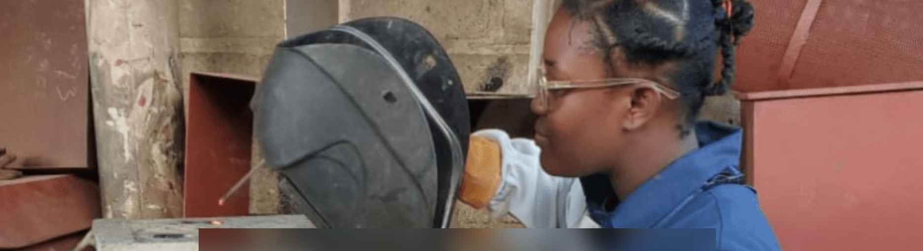 La herrera especializada en soldadura eléctrica, Marceille Merloude, suelda hierro en el taller donde trabaja en Trou du Nord.