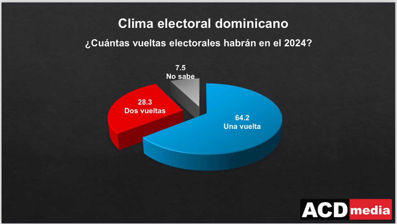 El 64.2% de los entrevistados dijo que habrá una sola vuelta, el 28.3% dos y el 7.5% dijo no saber, al responder la pregunta ¿Cuántas vueltas electorales habrá en el 2024?.