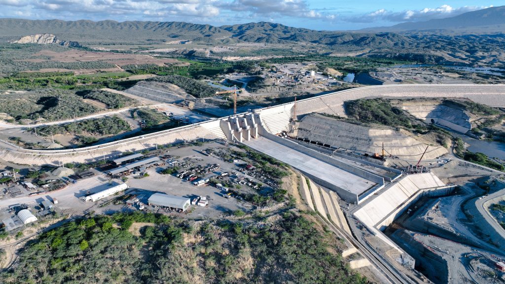La estructura, ubicada en la provincia de Azua, se erige como un muro imponente que represará las aguas del río Yaque del Sur, formando un lago de 350 millones de metros cúbicos.