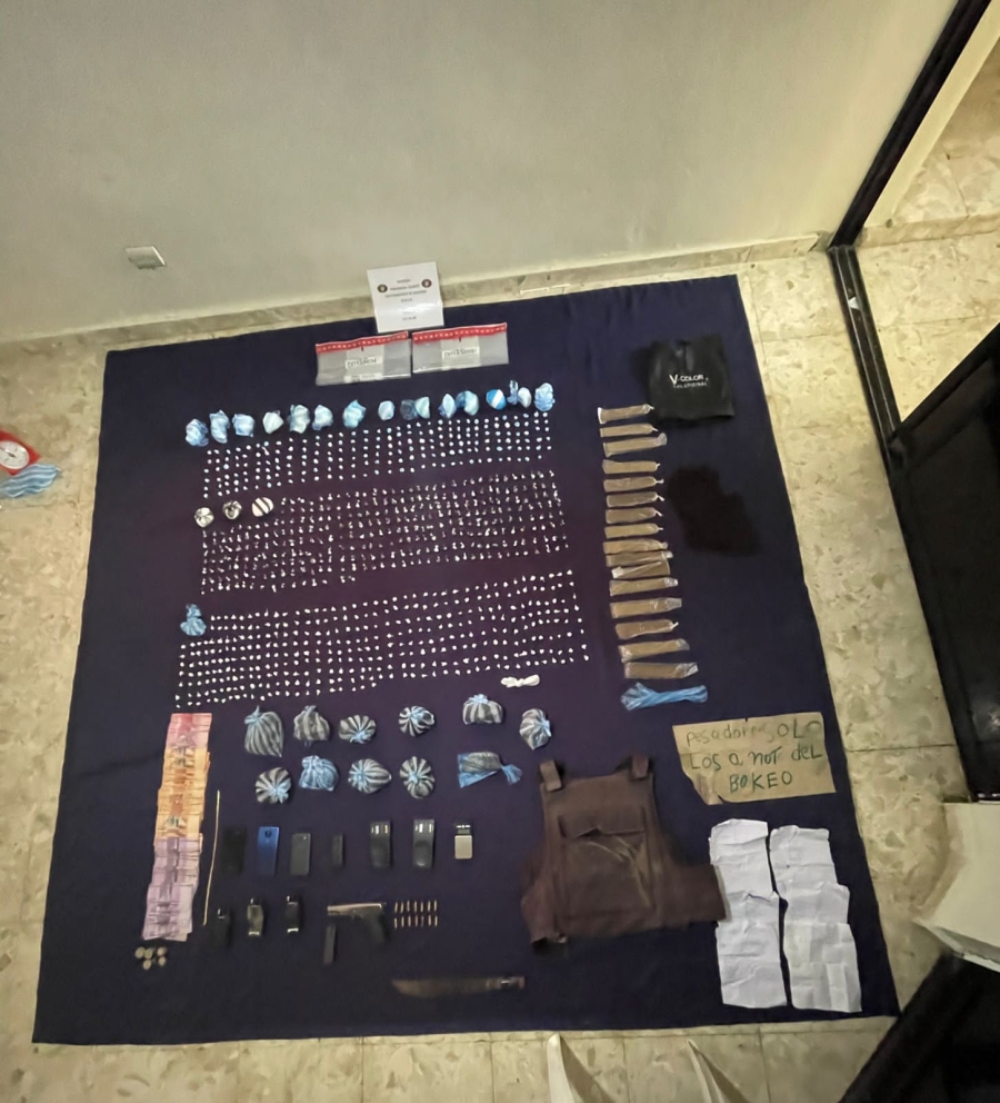 Además, se incautaron 02 pistolas calibre nueve milímetros, con cargadores y cápsulas, decenas de armas blancas, 03 balanzas, 05 radios de comunicación, un chaleco antibalas, dinero en efectivo, una motocicleta, dos máquinas tragamonedas y otras evidencias.