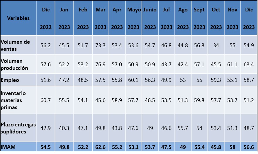 Para el mes de diciembre, tres de las cinco variables se mostraron a la baja y una de estas se colocó bajo la barrera de los 50.0: “Plazo de entrega suplidores” pasó de 51.3 a 48.7. Las otras dos variables a la baja fueron “Volumen de ventas” que pasó de 55.0 a 54.9, e “Inventario de Materias Primas” que pasó de 53.7 a 51.2. Mientras tanto, “Volumen de Producción” se incrementó al pasar de 61.1 a 63.4 y también se incrementó “Empleo” que pasó de 55.1 a 58.7.