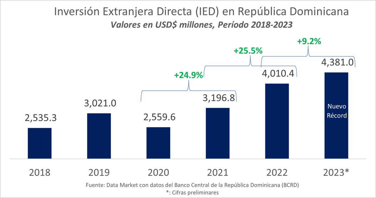 Santo Domingo.- Biviana Riveiro Disla, Directora Ejecutiva del Centro de Exportación e Inversión de la República Dominicana (ProDominicana), destacó el crecimiento de la Inversión Extranjera Directa en el país durante el 2023, la cual alcanzó la cifra de US$4,381 millones, para un incremento interanual de alrededor de 9.2 %, según el informe preliminar del Banco Central de la República Dominicana (BCRD), y representa un crecimiento de 45% si lo comparamos con el año prepandemia 2019.