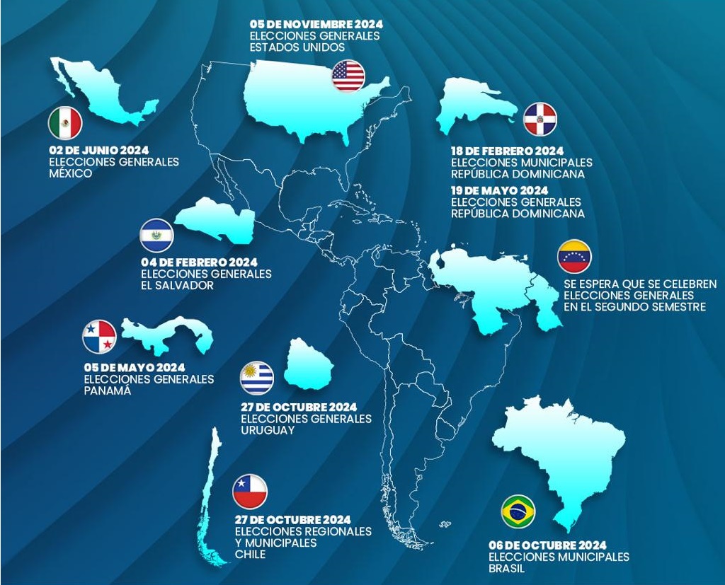 El año 2024 se celebrarán importantes elecciones en la región, desde Elecciones Generales en la que se elige a los titulares de los Poderes Ejecutivo y Legislativo, hasta elecciones subnacionales como en el caso de Brasil, Chile y República Dominicana. A continuación, los comicios que ya se han definido para América Latina: