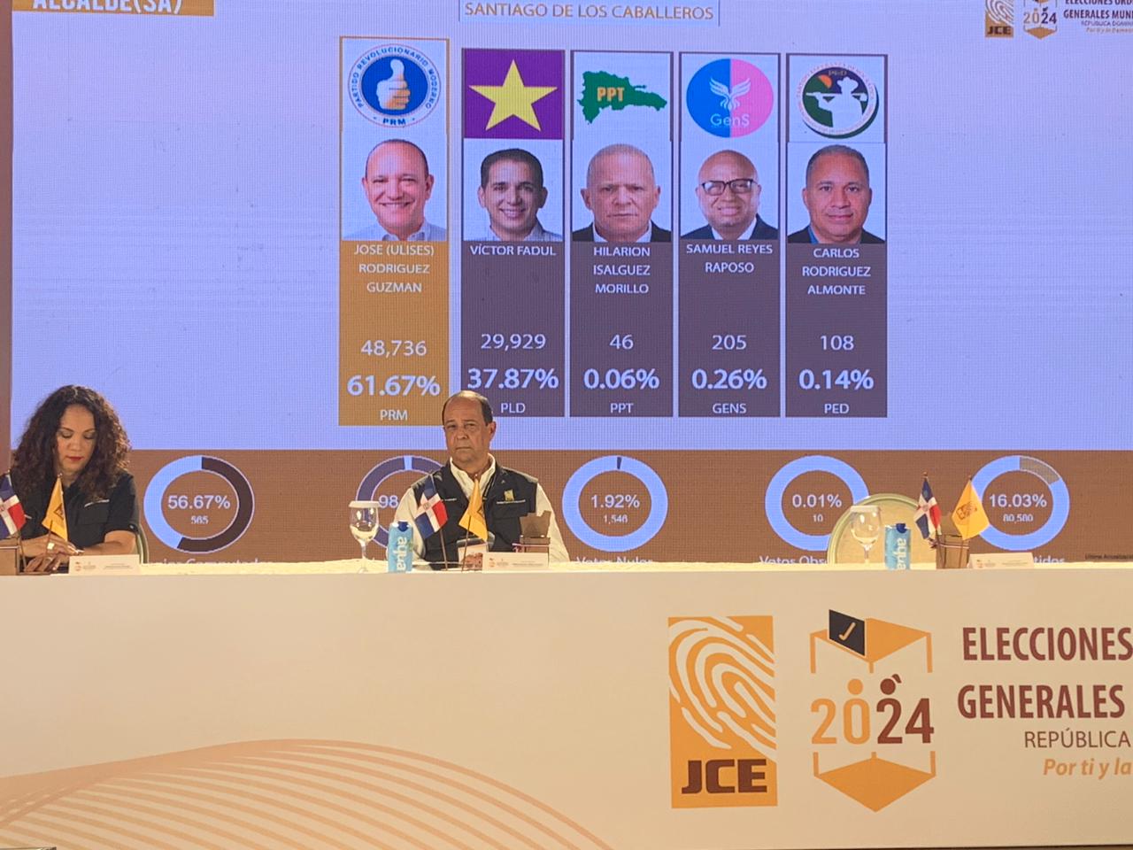 Mientras que en Santiago, José Ulises Rodríguez, del oficialista PRM, encabeza con 61.67 por ciento, superando a Víctor Fadul, del PLD, que tiene 37.87 por ciento.