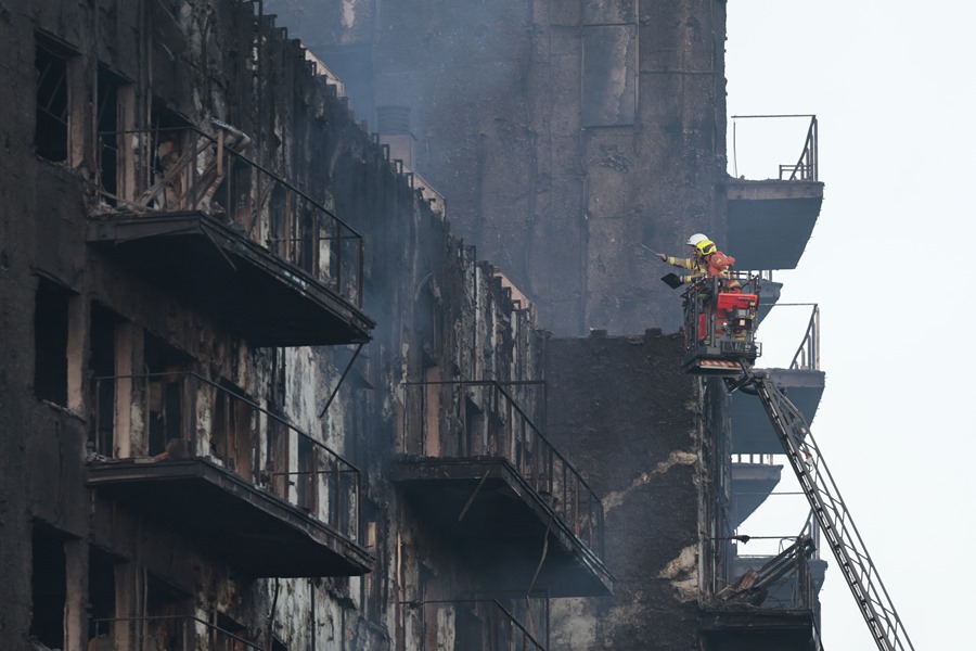 Los bomberos continúan trabajando este viernes tras el fulminante y devastador incendio en un edificio de viviendas de catorce plantas en València