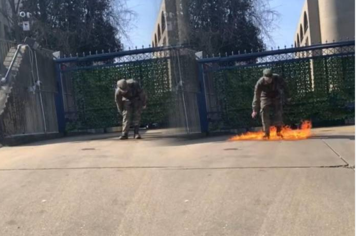 Luego coloca el dispositivo de grabación en el suelo antes de verter un líquido desconocido sobre sí mismo y encenderlo mientras grita “Palestina libre” repetidamente. Finalmente se desploma cuando los agentes de policía se apresuran a apagar las llamas con extintores.