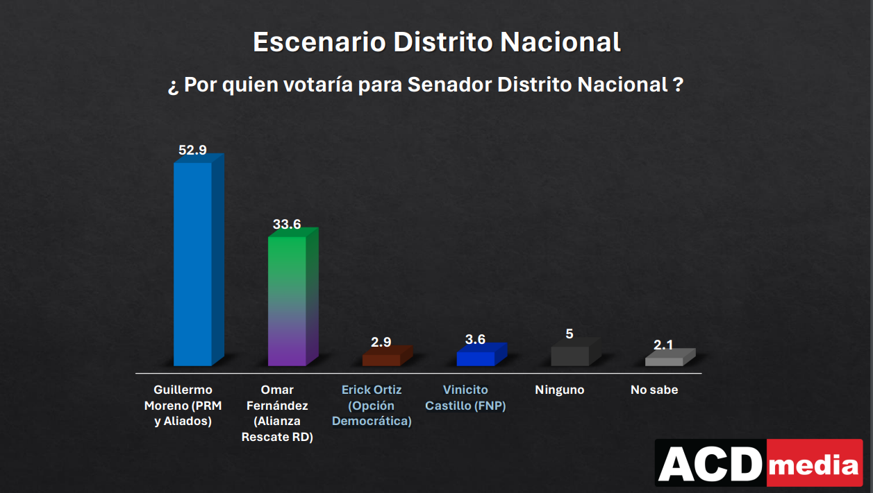 Santo Domingo RD—Según la encuesta realizada por el grupo de comunicación ACD Media, el presidente del partido Alianza País, Guillermo Moreno, se proyecta como el ganador de la senaduría del Distrito Nacional con un 52.9%.