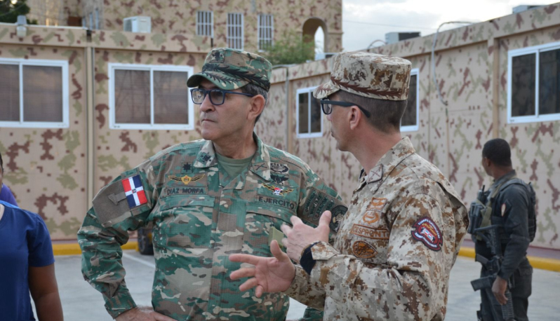Al ministro le acompañan el director del Centro de Comando, Control, Comunicaciones, Computadoras y Ciberseguridad (C5i), vicealmirante Luis Rafael Lee Ballester, ARD; el director de Planes y Operaciones del Estado Mayor Conjunto del MIDE, (J3), general de brigada Rafael Antonio Núñez Veloz, ERD; el general de brigada, Freddy R. Soto Thorman, ERD, director del Cuerpo Especializado de Seguridad Fronteriza Terrestre (Cesfront), y el supervisor de la verja perimetral, general de brigada Luis A. Coronado Abreu, ERD.