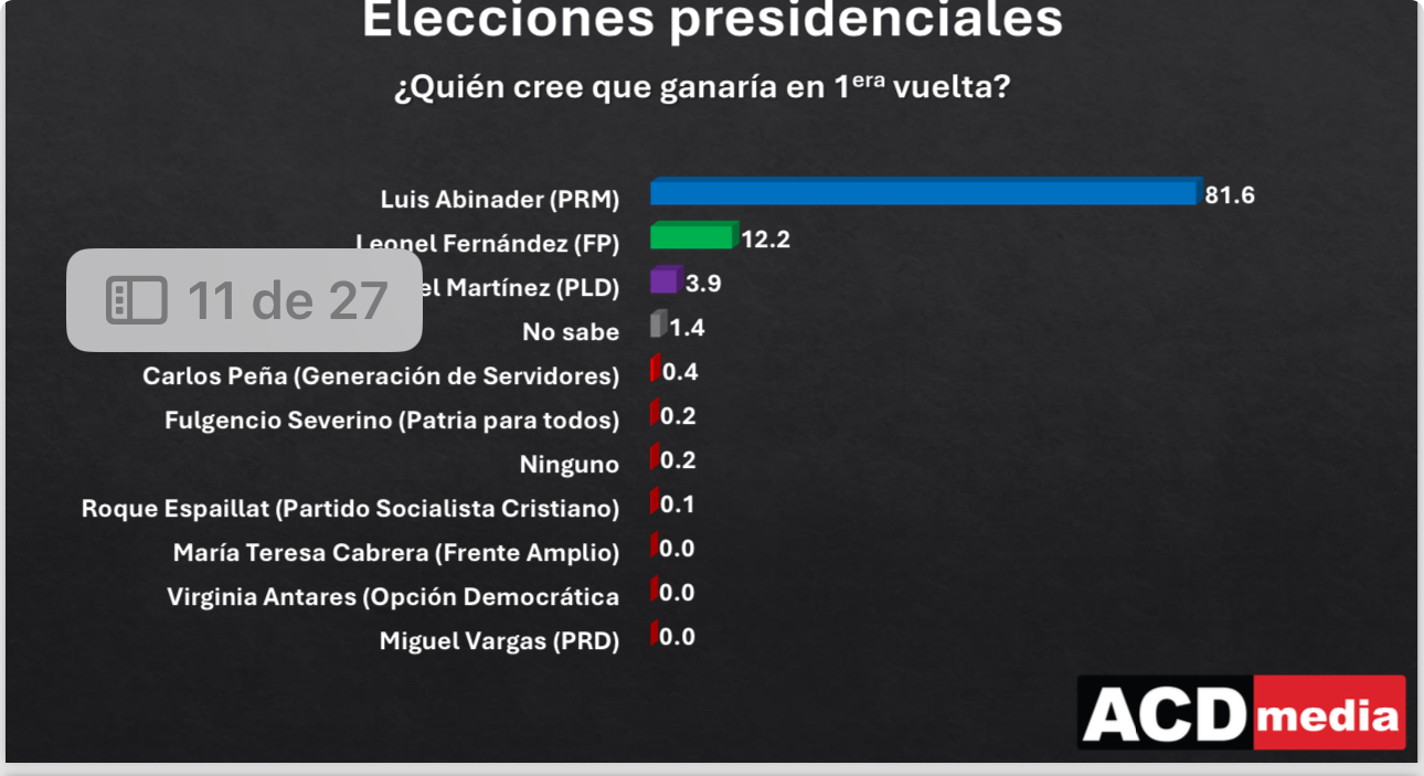 Santo Domingo.-El 81.5% de los votantes considera que el presidente Luis Abinader ganará las elecciones presidenciales del 19 de mayo, el 12.2% entiende que Leonel Fernández y el 3.9% que será Abel Martínez de acuerdo a los resultados de la 12va entrega de la Encuesta Nacional de Opinión Pública del Grupo de Comunicación ACDmedia, dada a conocer este viernes.