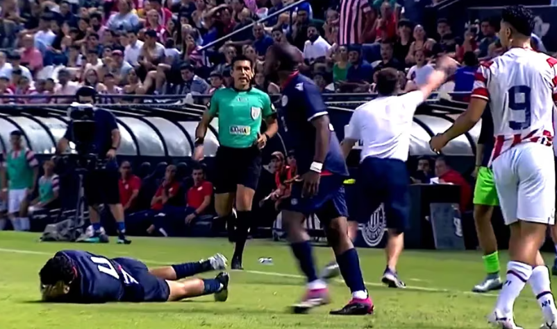 El altercado se produjo sobre el final y con el marcador ya sentenciado. En un ataque paraguayo, el defensa dominicano Edgar Pujol pudo cortar la jugada al imponer su cuerpo sobre el de Kevin Parzajuk quien al caer, producto del forcejeo, golpeó el rostro de su rival con el botin en una polémica acción.