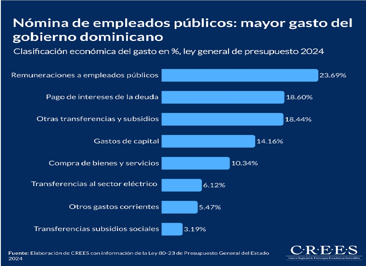 Santo Domingo, RD.- El 42.3% del gasto público se destina al pago de las prestaciones y beneficios a empleados públicos, y a los intereses de la deuda pública. Solo el 23.7% del gasto es para la nómina pública.