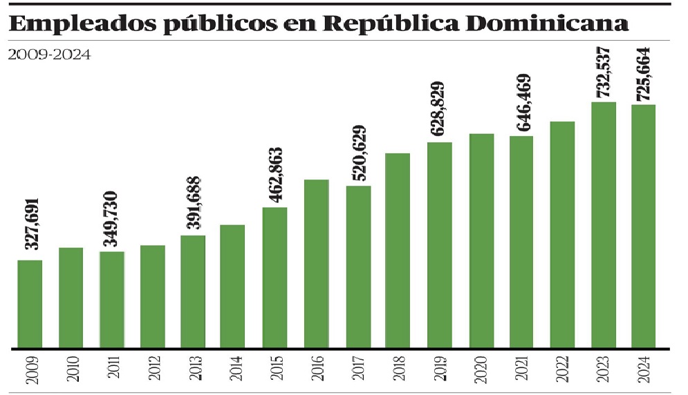 Pero, de acuerdo al Centro Regional de Estrategias Económicas Sostenibles (Crees), a pesar de la disminución, el 2024 ha sido un año que registra gran cantidad de empleados del Estado, ya que, al comparar los datos de febrero de 2024 con los de febrero de 2009, que es la más antiguo disponible, se observa un aumento del 121.45% en la cantidad de empleados públicos, lo que equivale a un incremento de 397,973 empleados en total.