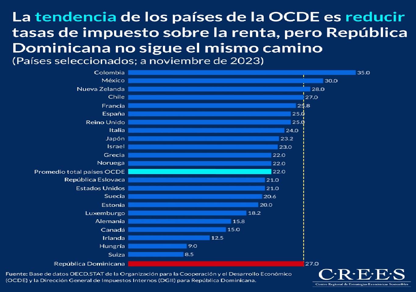 En sentido general, en los países de la OCDE ha prevalecido el concepto de establecer políticas tributarias basadas en los fundamentos económicos que ayudan a mejorar el clima de negocios y mejorar la inversión. Es decir, esas economías han decidido bajar tasas impositivas, tal como lo hizo República Dominicana cuando redujo su tasa de impuesto sobre la renta a personas jurídicas de 46% a 25% luego de la promulgación del Código Tributario de 1992.