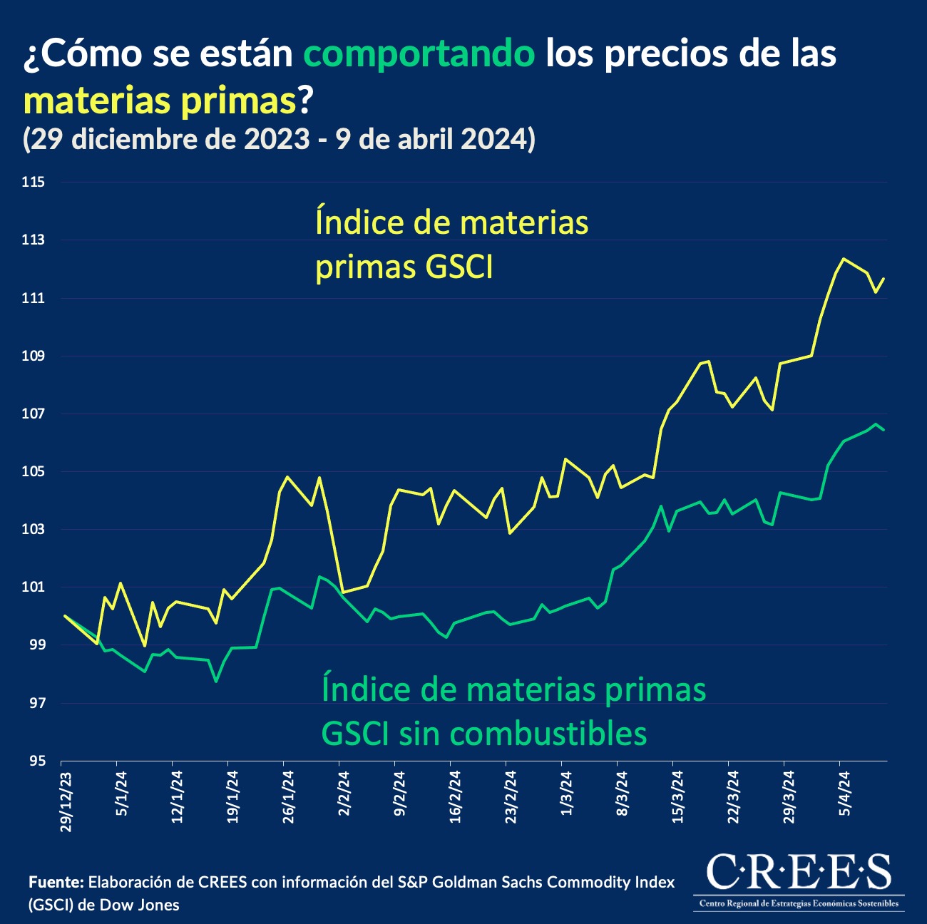 Santo Domingo, RD.- Entre enero y abril del 2024, el Índice de Precio de las Materias Primas S&P GSCI de Dow Jones ha verificado aumentos en sus precios de 11.7%. Mientras que si excluimos los combustibles del índice, el aumento sería de 6.4%.