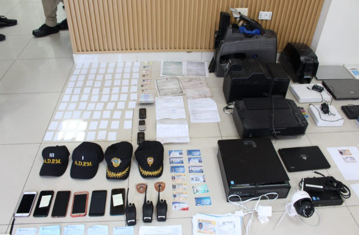 En el operativo los agentes se incautaron de cédulas de identidad y electoral, actas de nacimiento presumiblemente falsas, carnés de distintas entidades públicas y privadas, computadoras personales (laptops) e impresoras, formularios, fotos, certificaciones y sentencias de la Junta Central Electoral, certificados de no antecedentes penales falsos, entre otro tipo de documentos, así como una motocicleta, dos yipetas y un celular.