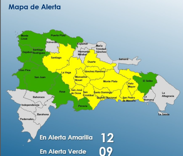 Santo Domingo RD–EL Centro de Operaciones de Emergencias (COE), aumento 11 provincias y al Distrito Nacional en alerta amarilla y mantiene 09 en verde, debido a que continúan las condiciones favorables para que sigan produciéndose aguaceros de moderados a fuertes en ocasiones, tormentas eléctricas y ocasionales ráfagas de viento a causa de la vaguada ubicada al noreste del país, la cual juntos la humedad existente mantendrá la actividad de lluviosa hacia las regiones noreste, norte, sureste, cordillera central y la zona fronteriza.