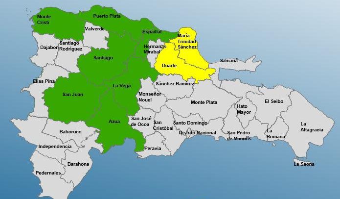 Las provincias en alerta amarilla por posibles crecidas de ríos, arroyos y cañadas, así como inundaciones repentinas o urbanas, son María Trinidad Sánchez y Duarte, mientras que en nivel verde se encuentran Santiago, Montecristi, Espaillat, La Vega, Puerto Plata, San Juan y Azua.