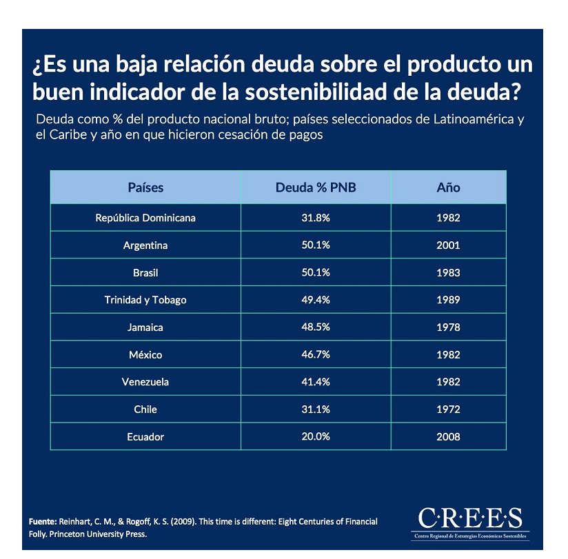 Como se puede apreciar en la gráfica anterior, la relación deuda sobre producto no es un buen indicador de sostenibilidad. En niveles considerados bajos de relación endeudamiento público sobre producto, muchos países llegaron a cesar el pago de sus deudas.