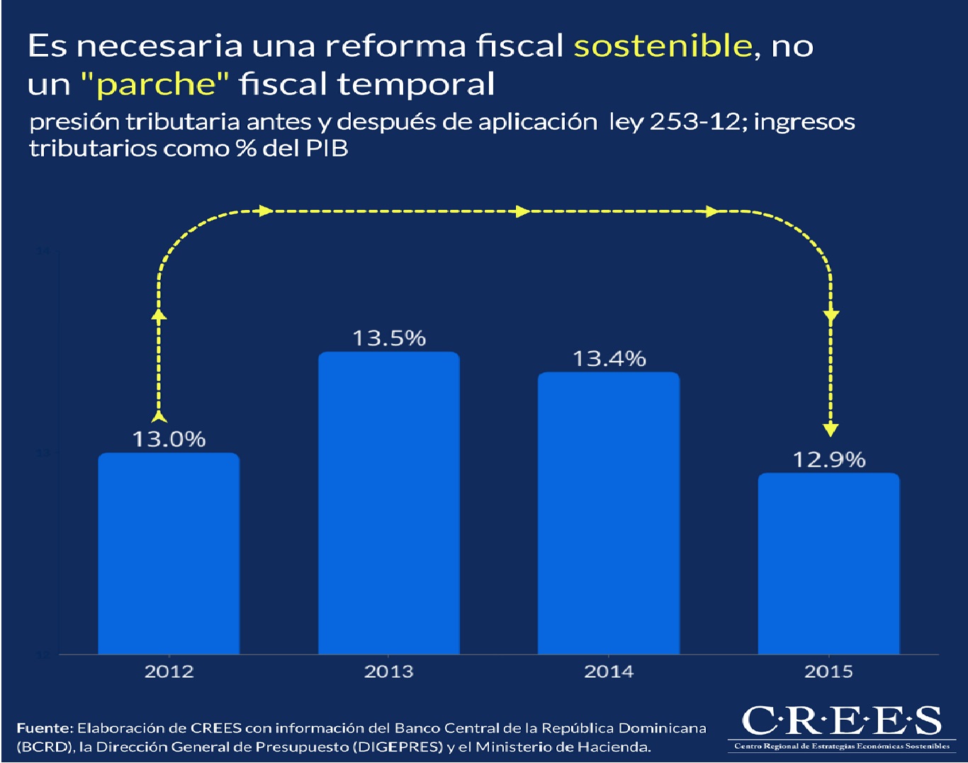 En 2013 se implementó una ambiciosa modificación tributaria, la ley 253-12, que pretendía, por su título, fortalecer la capacidad recaudatoria del estado dominicano.